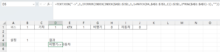 버스 1 기차 1 KTX 1 비행기 0 자동차 0위와 같이 엑셀 셀이 있을 때Case 1 : 1을 설정- 요청 : 맨 오른쪽 숫자 1 옆의 오른쪽 셀 문자를 합쳐 나타냄- 결과 : 비행기 -> 자동차위와 같이 숫자 1 옆의 오른쪽 셀 중에 숫자를 제외한 문자 셀의 합을 나타나도록거는 함수가 궁금합니디 ㅠ알러주시면 감사합니다! =TEXTJOIN("->",1,